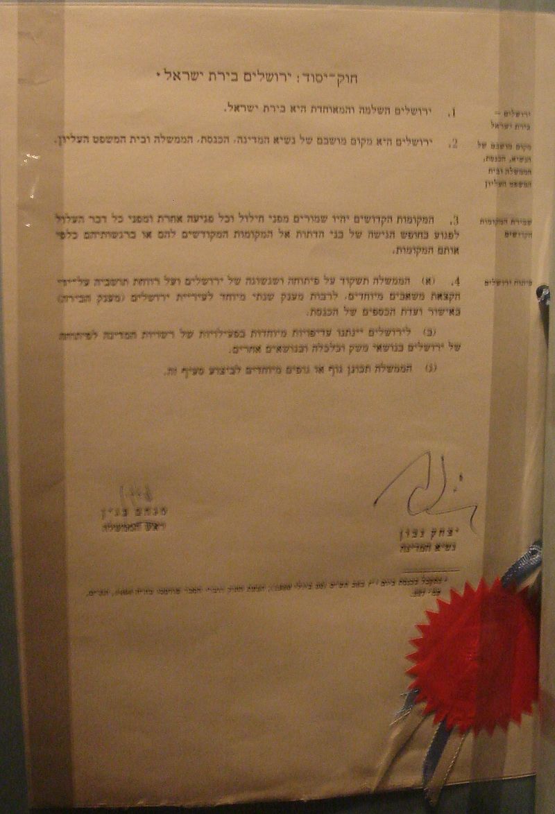 Depois da Guerra dos Seis Dias, a Cidade foi reunificada. Em 30 de Julho de 1980, o parlamento de Israel aprovou como lei básica: "JERUSALÉM: A CAPITAL DE ISRAEL - Jerusalém unida e completa é a Capital de Israel."